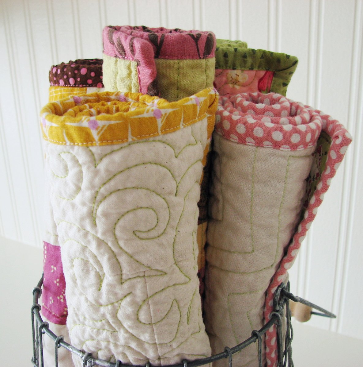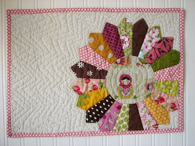 I don't always know what my mom will like, but I know that she LOVES dolls. So I bought a fat quarter of Babushka doll fabric, and used it as color inspiration. I also put a bit of this fabric into each placemat.