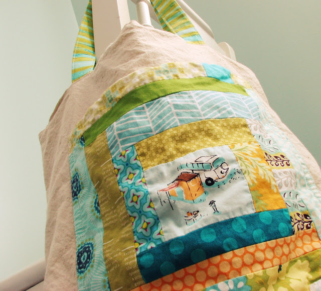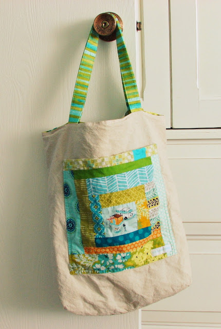 Ok, I'm not going to the beach, but I will be going away for a few days and I had the urge to make myself a bag. I wanted something casual but fun. I started out with this log cabin block for a pocket on the front.