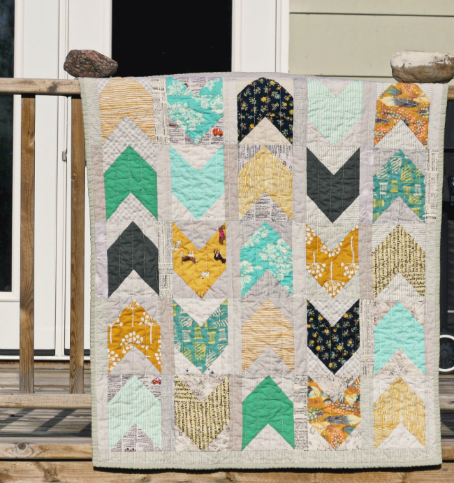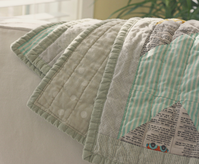 I like to have a wide variety of different shades and colors, and well as different prints. These fabrics are similiar to solids in their practicality, but they have a print which adds some interest to your quilt. I like to have a variety of prints. Some stripes, polka dots, old fashioned geometrics and tiny florals, modern graphic prints, text, and reproduction fabrics. (Just a word on reproduction fabrics, which are those tiny prints that have been reprinted and inspired by fabrics from years ago. I find a whole quilt made from these fabrics to be drab, but I love to mix a few in to my quilts. These old fashioned collections have some great basics that look amazing when paired with the more modern prints.)