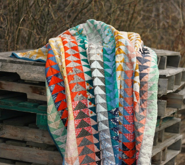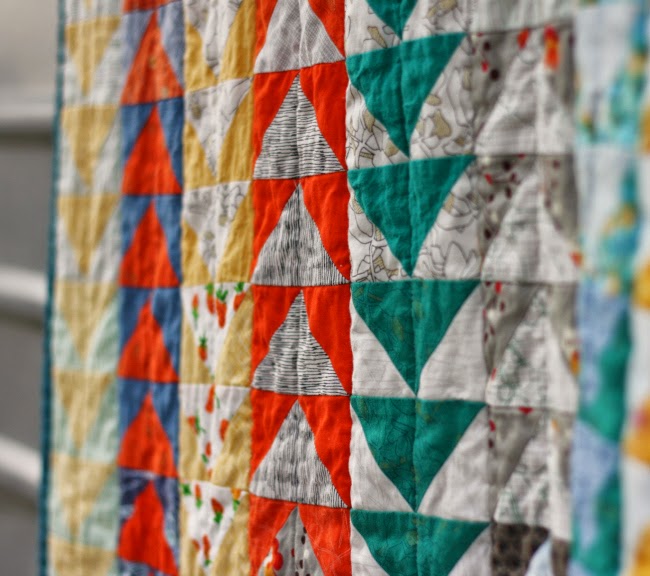 The quilt top finishes at about 37"x41", just perfect for a baby quilt. I had originally planned to make just pinwheel blocks, but to maximize these 6 fat quarters, I decided to add a strippy border to the right hand side with the left over pieces.