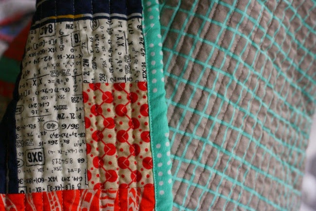 Now on to this quilt. It. is. bright. I love it's quirky craziness. That purple just clashes so amazingly with the red:) When you see that teal floral print up close, it all makes sense because the print includes this magenta and red so well.
